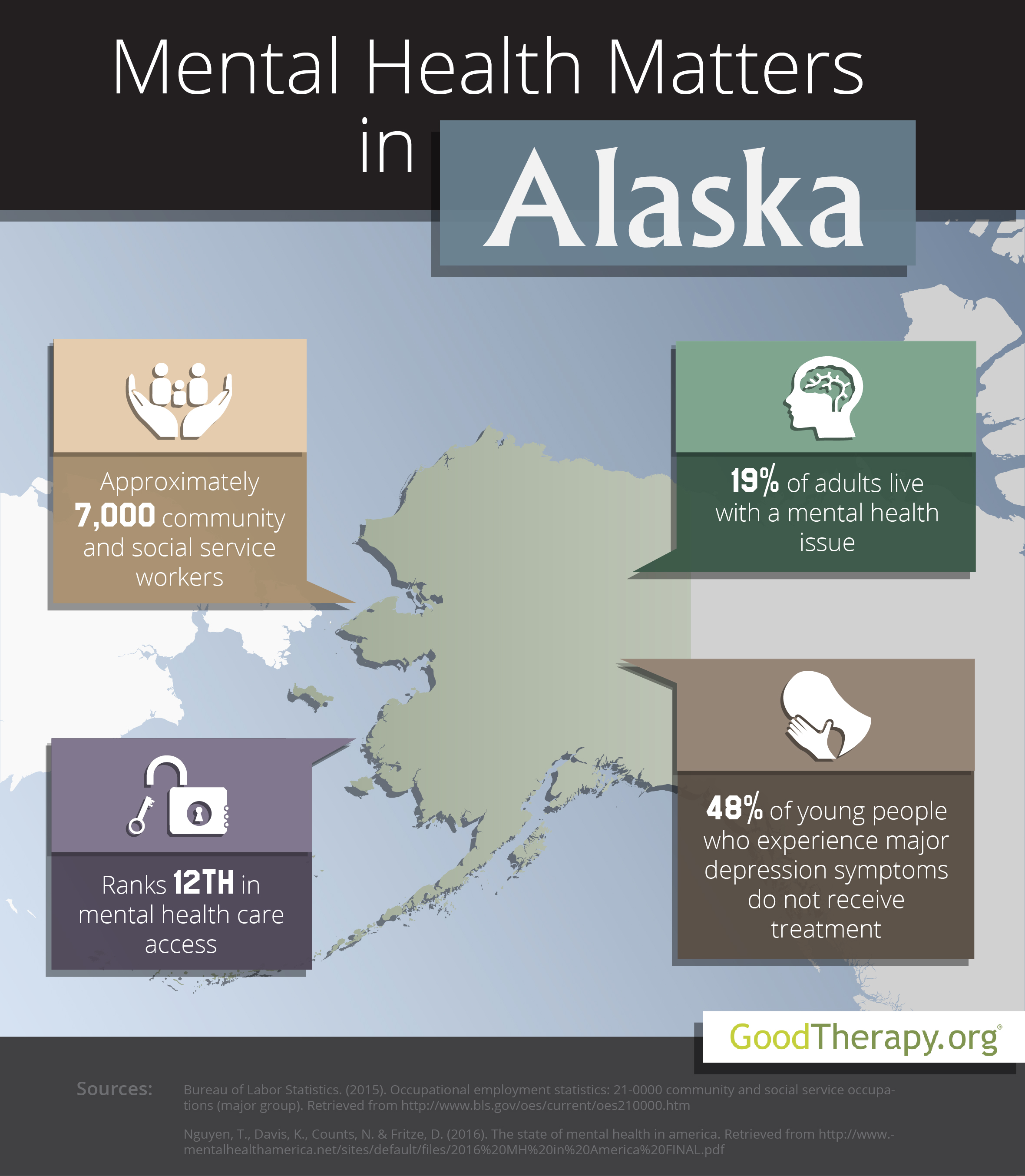 Mental Health in AlaskaIn 2016, Alaska received an overall ranking of 9th—out of all 50 states and the District of Columbia—in the annual mental health survey conducted by Mental Health America (MHA). Researchers suggest this ranking correlates with relatively low rates of poverty in the state.