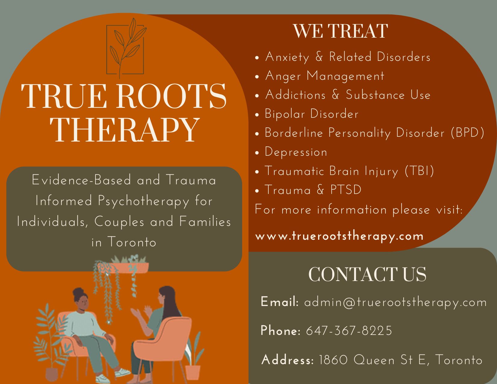 True Roots Therapy is a practice with deeply rooted values of empathy, compassion, and authenticity. We’re a team of experienced practitioners dedicated to connecting with the individual, couple, or family that we are working with. There is no “one-size fits all” approach to therapy, so we take the time to learn about who you are: your history, experiences, and story so far. You are one of a kind, your treatment should be too.