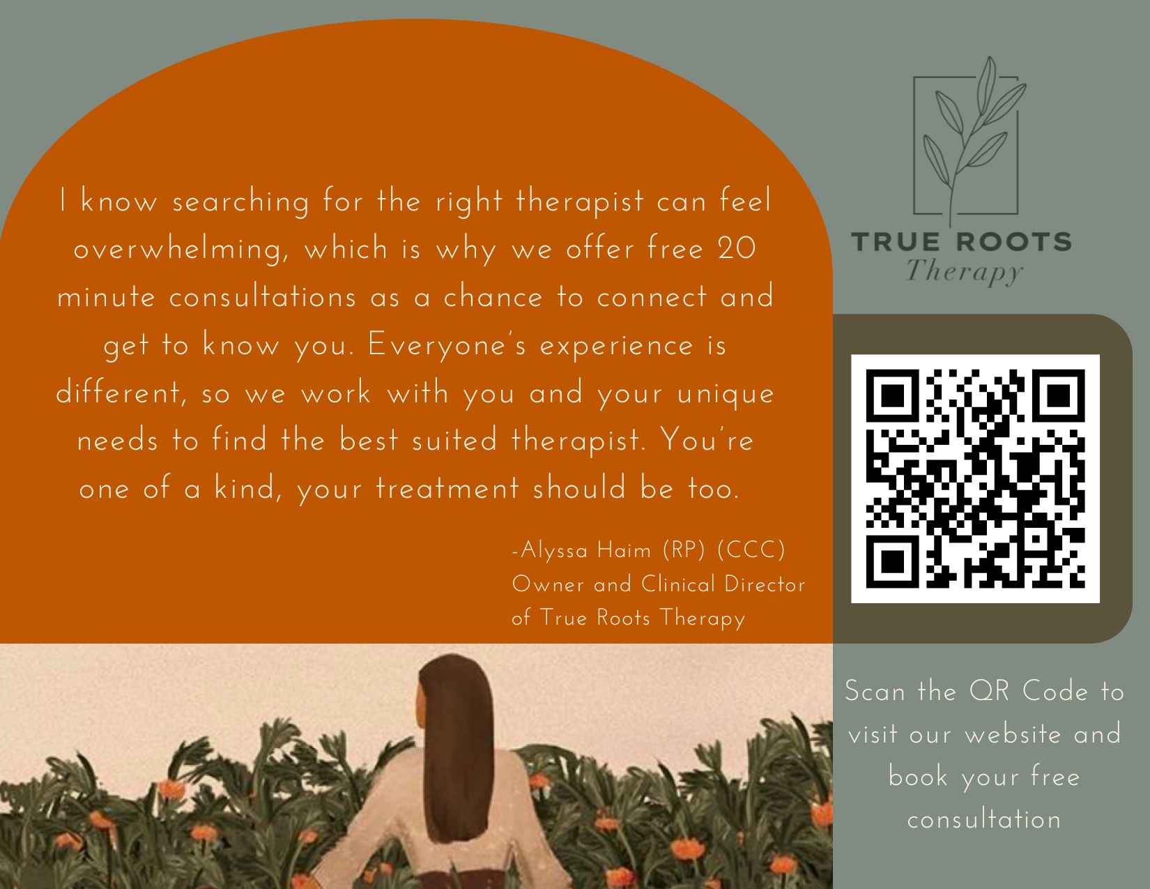 Whether you’ve been to therapy before or this is your first time here, welcome. I’m so glad you’re here. I know searching for the right therapist can feel overwhelming, which is why we offer free 20-minute consultations as a chance to connect and get to know you.