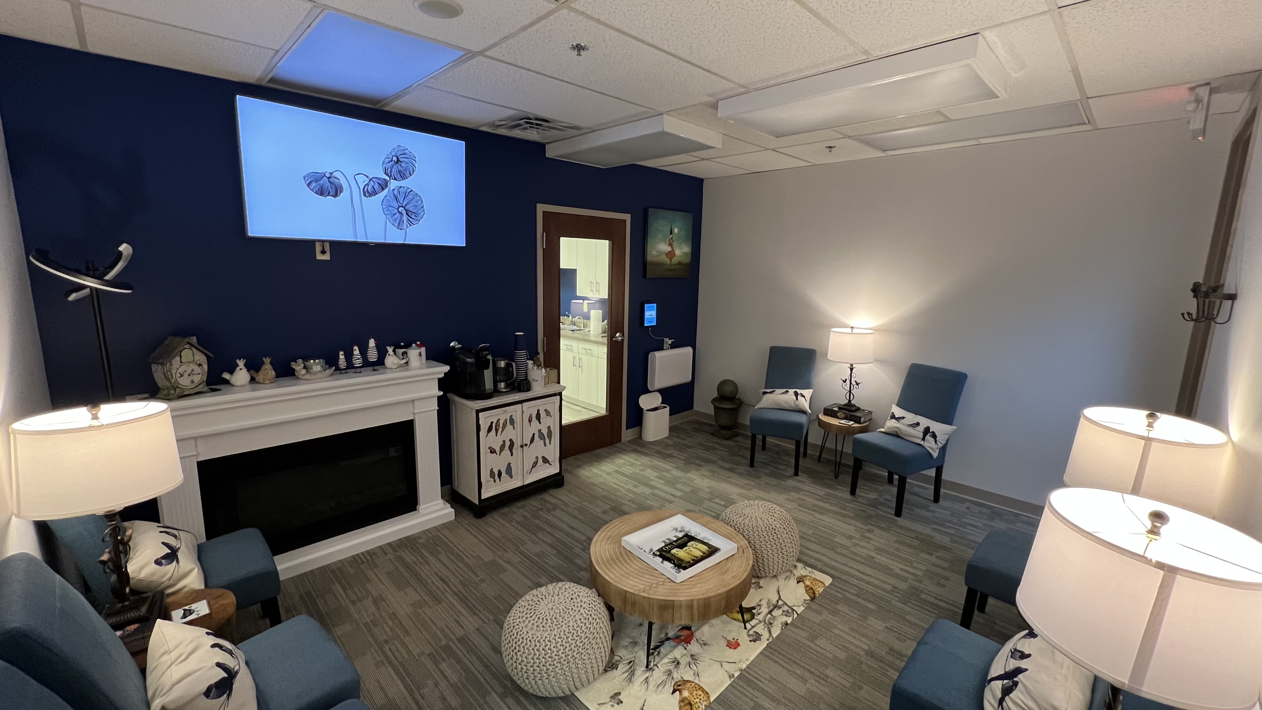 My office is within Creve Coeur Counseling Associates on the 3rd floor. We have a nice waiting area that provides beverages. We also have a nice open break room right by the office that has seating, ice machine and a television.
