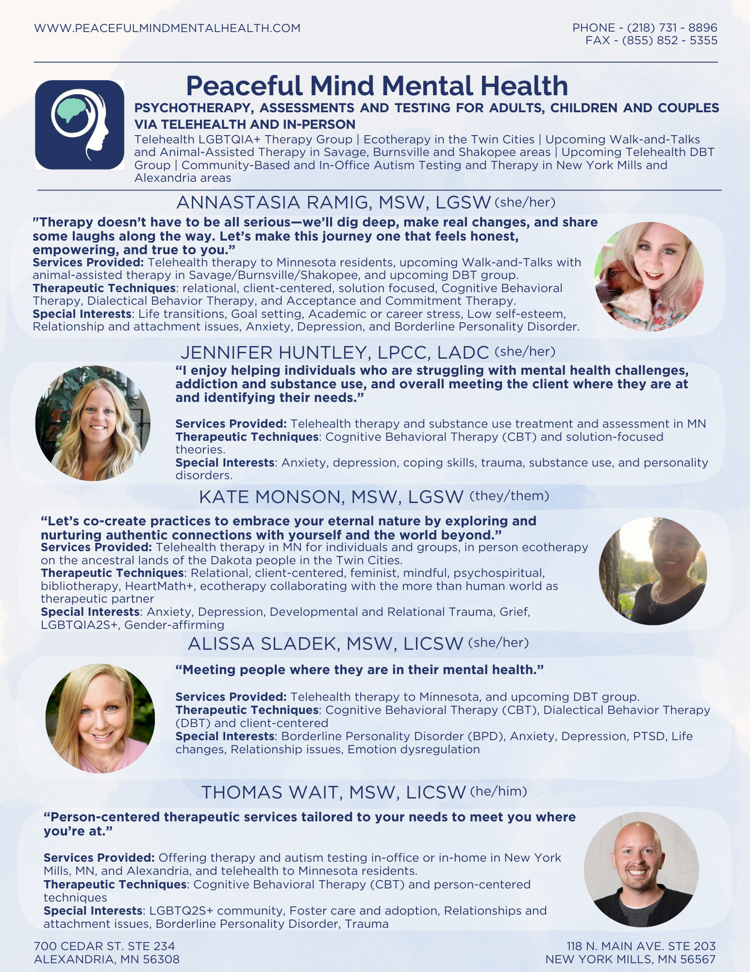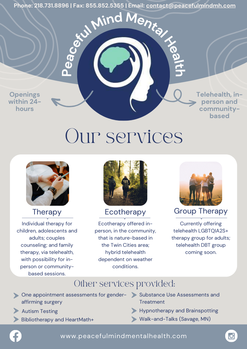 I offer Walk & Talk therapy (with or without my pup!), as well as telehealth services for attention-deficit hyperactivity (ADHD), anxiety, relationship concerns, and navigating new life chapters. If you’re feeling anxious, stuck, or overwhelmed, like your mind is constantly juggling a hundred open tabs, you’re not alone. I work with young and middle-aged women across Minnesota to build clarity, confidence, and a greater sense of calm, without the expectation of having everything figured out.