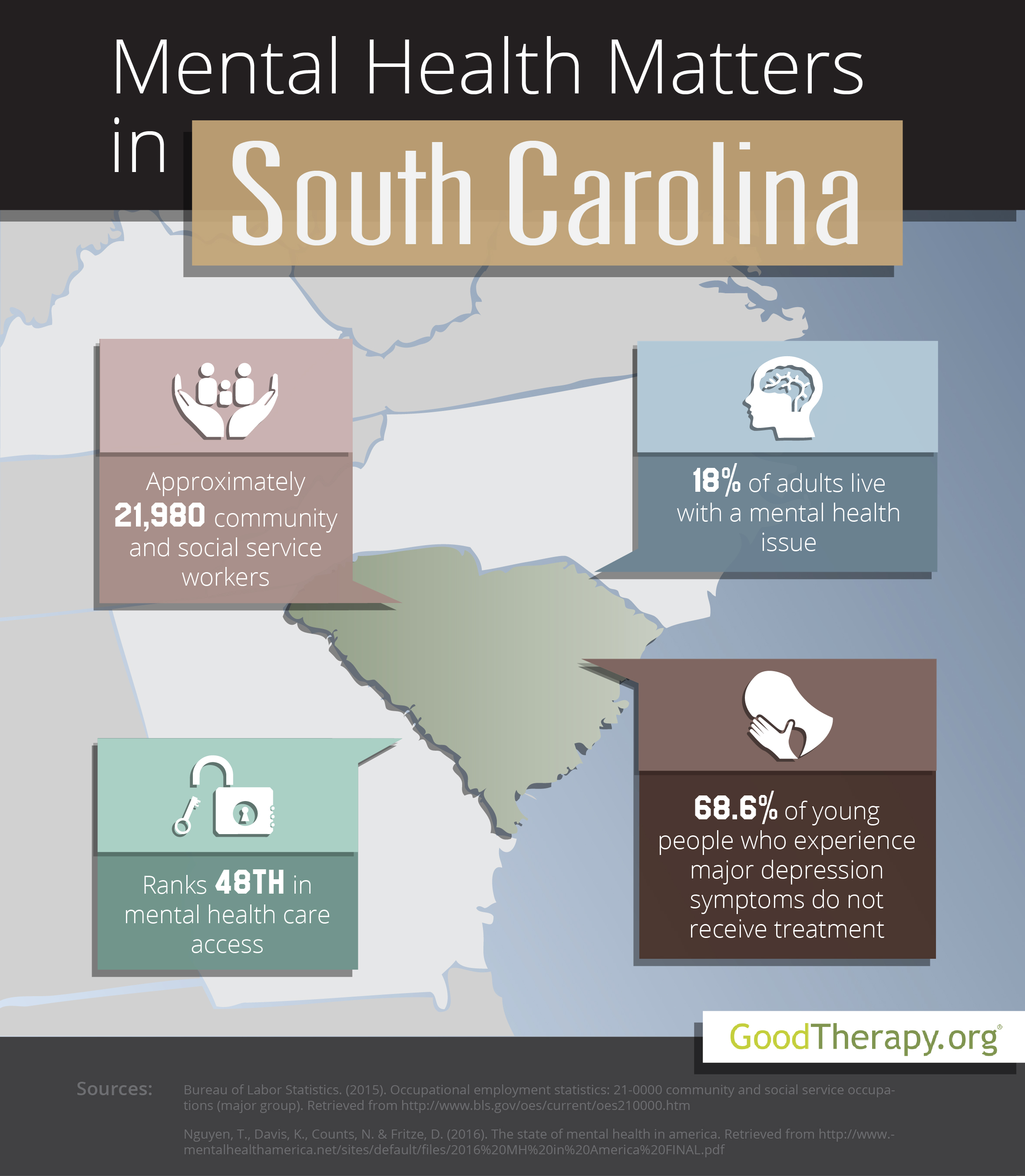 Mental Health in South CarolinaIn 2016, Mental Health America (MHA) compared all states and the District of Columbia for current mental and behavioral health standards. After the survey was completed, the state of South Carolina was 38th in adult ranking, 43rd in youth ranking, 23rd in prevalence of adverse mental and behavioral health issues, and 48th in access to mental health care. Researchers who conducted the survey and some therapists in South Carolina believe the state’s low access to care ranking correlates with several local socioeconomic features such as low rates of graduation for students with disabilities, and high rates of unemployment, obesity, violent crime, and poverty. South Carolina received an overall mental health rank of 38th, placing in the lower half of the list.